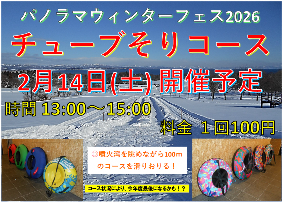 チューブそりを急遽下記の日程で開催いたします!今年度最後となるかもしれないチューブを是非お楽しみください♪