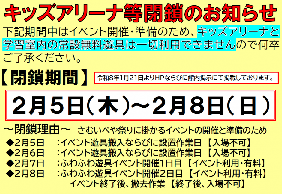 閉鎖期間:令和8年2月5日(木) ~ 2月8日(日)
